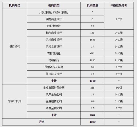 据央行官网最近一次公布2020年四季度的评级结果,4399家银行业金融机构的评级,包含大型银行24家、中小银行3999家、非银行机构376家。