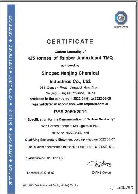 5月6日,中国石化南化公司橡胶防老剂产品6PPD和TMQ获得由TUV南德认证的碳足迹证书和碳中和产品证书010122001、010122002号,成为我国首例获得国际认证的橡胶防老剂碳中和产品。
