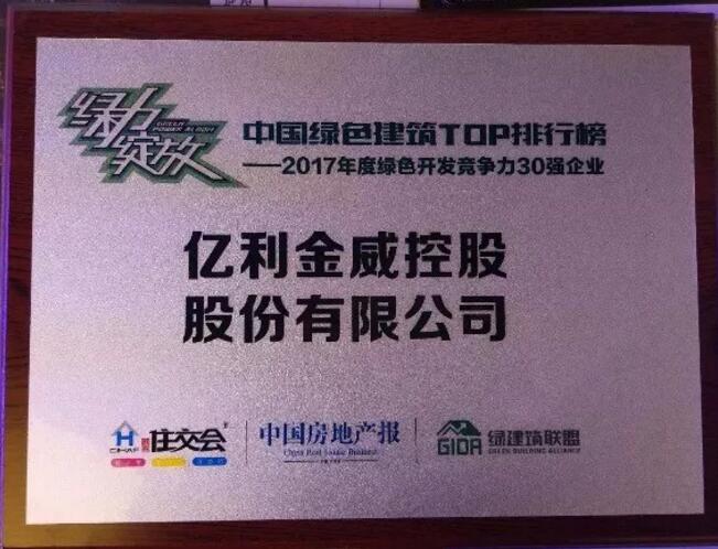 基于此背景下,本次峰会独家发布《2017年度中国绿色地产发展报告》及“2017中国绿色建筑TOP排行榜”。亿利金威控股股份有限公司(以下简称:亿利金威控股)以榜样的力量,与恒大、碧桂园、中海、远洋等房企共同荣获中国绿色建筑TOP排行榜2017年度绿色开发竞争力30强企业奖。