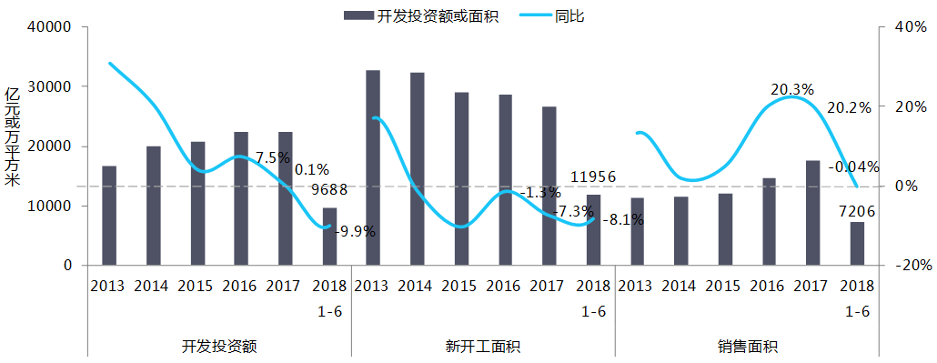 供应:2018年上半年,商业地产开发投资额9688亿元,同比下降9.9%,新开工面积11956万平方米,同比下降8.1%;