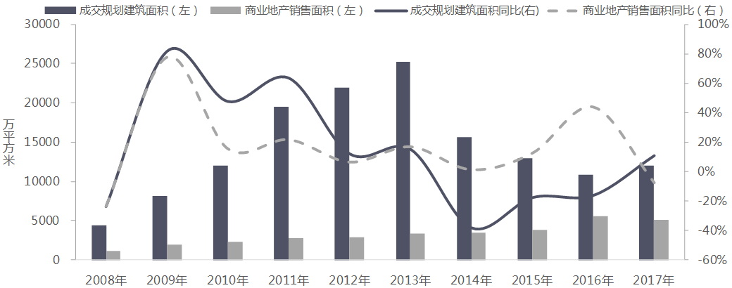 图:2008年-2017年全国40个重点城市商办用地成交规划建筑面积与商业地产销售面积及同比增速