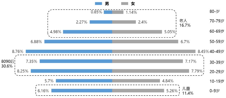 图:2016年中国男性/女性各年龄段人口及比例