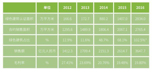 *注:万科绿色建筑认证面积数据来源于万科集团2016年企业社会责任报告,其数据稍大于当年合约销售面积(数据来源于2016年年报),可以理解为因房地产行业的特征,在会计统计上,合约销售面积仅指签订购房合同时的销售面积。而真正申报绿色建筑认证标识,往往时间会延后,可能需要竣工后才能获得证书,这一时间差,会导致上一年度申报的绿色建筑被统计到本年度,于是绿色建筑占比会有大于100%的现象。